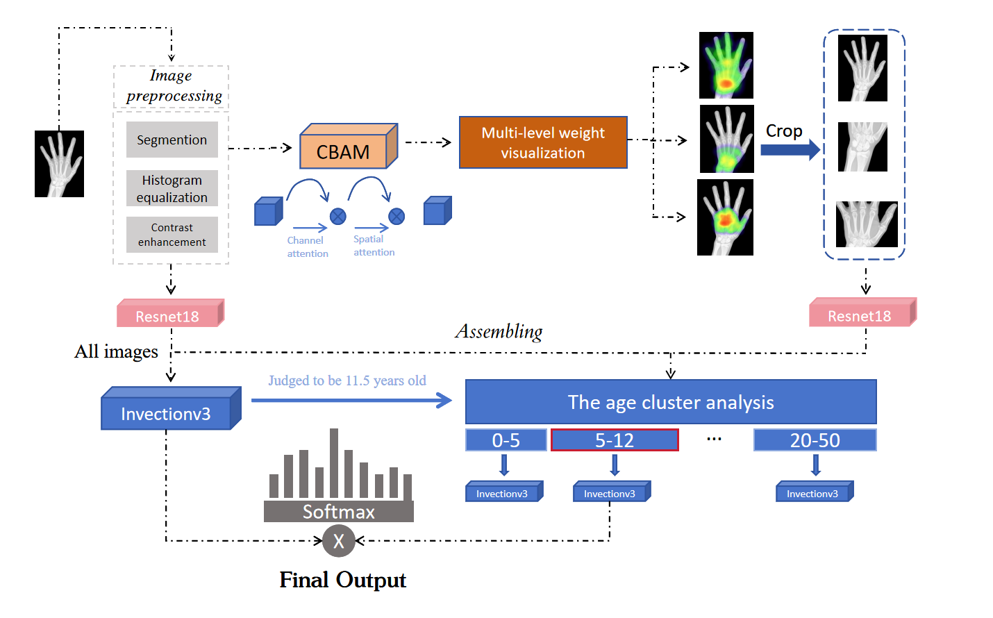 Bone age assessment (BAA) is a critical research topic in pediatric radiology, with growing interest in developing automated BAA methods. This study proposes a bone age prediction model integrating cluster analysis and convolutional neural network (CNN) regression, further enhanced by a multi-scale attention mechanism to construct a “divide-and-focus” dual-driven deep learning framework.