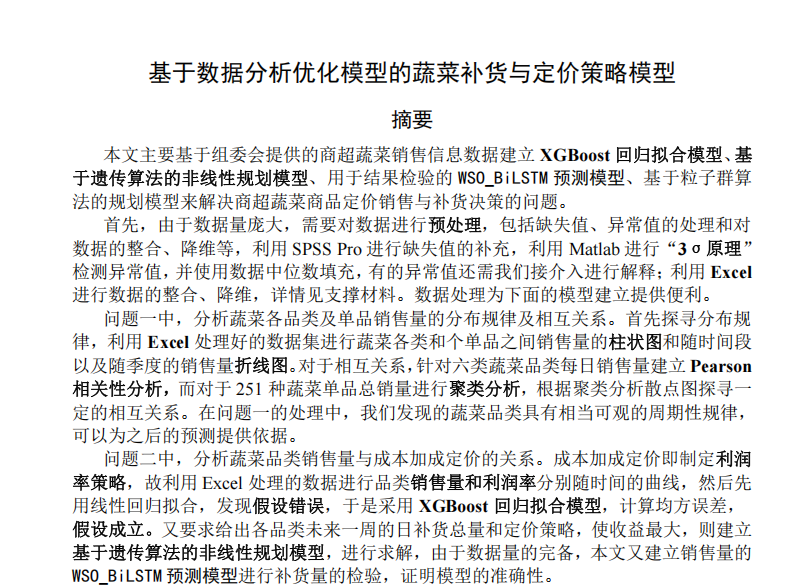 该比赛中主要针对蔬菜订购问题进行算法的搭建与问题的解决,本人担任队长,负责利用相关深度学习XGBoost、LSTM等使用Pytorch框 架加速训练和相关优化算法遗传算法、灰狼算法等来进行模型的搭建和Python代码的编写,最终产出一篇竞赛论文并投稿为一篇IE会 议,全国二等奖奖项。